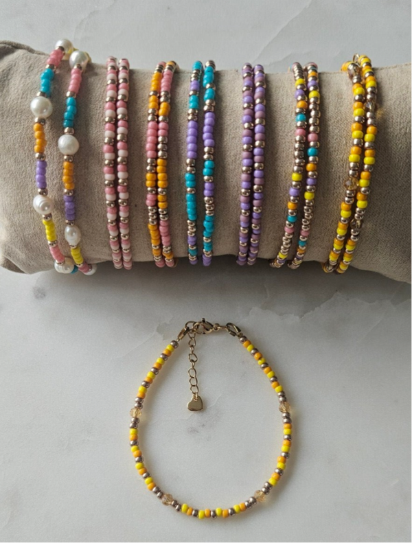 De armbanden uit deze collectie zijn gemaakt van kwalitatief hoogwaardige rocaille glaskralen van het merk 'Miyuki'. Alle kraaltjes zijn van gelijke vorm en kleur. De hoge kwaliteit van deze kralen zorgt ervoor dat alle sieraden lang mee kunnen.