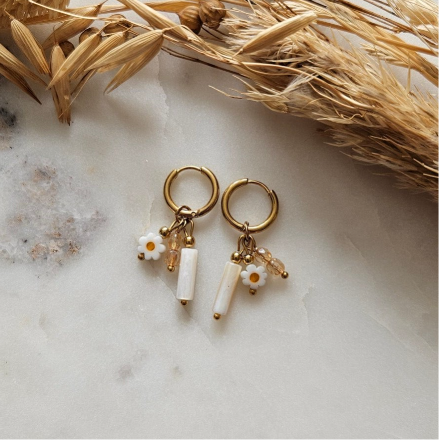 Oorbellen - goud / white & flower