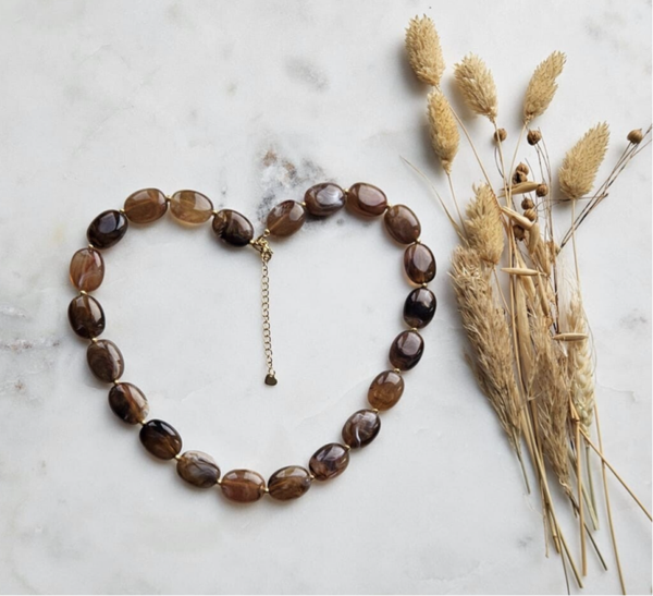 Gemaakt met ovale acryl kralen en afgewerkt op een stainless steel sluiting. Als basis van de ketting heb je de keuze uit een gouden of zilveren basis.