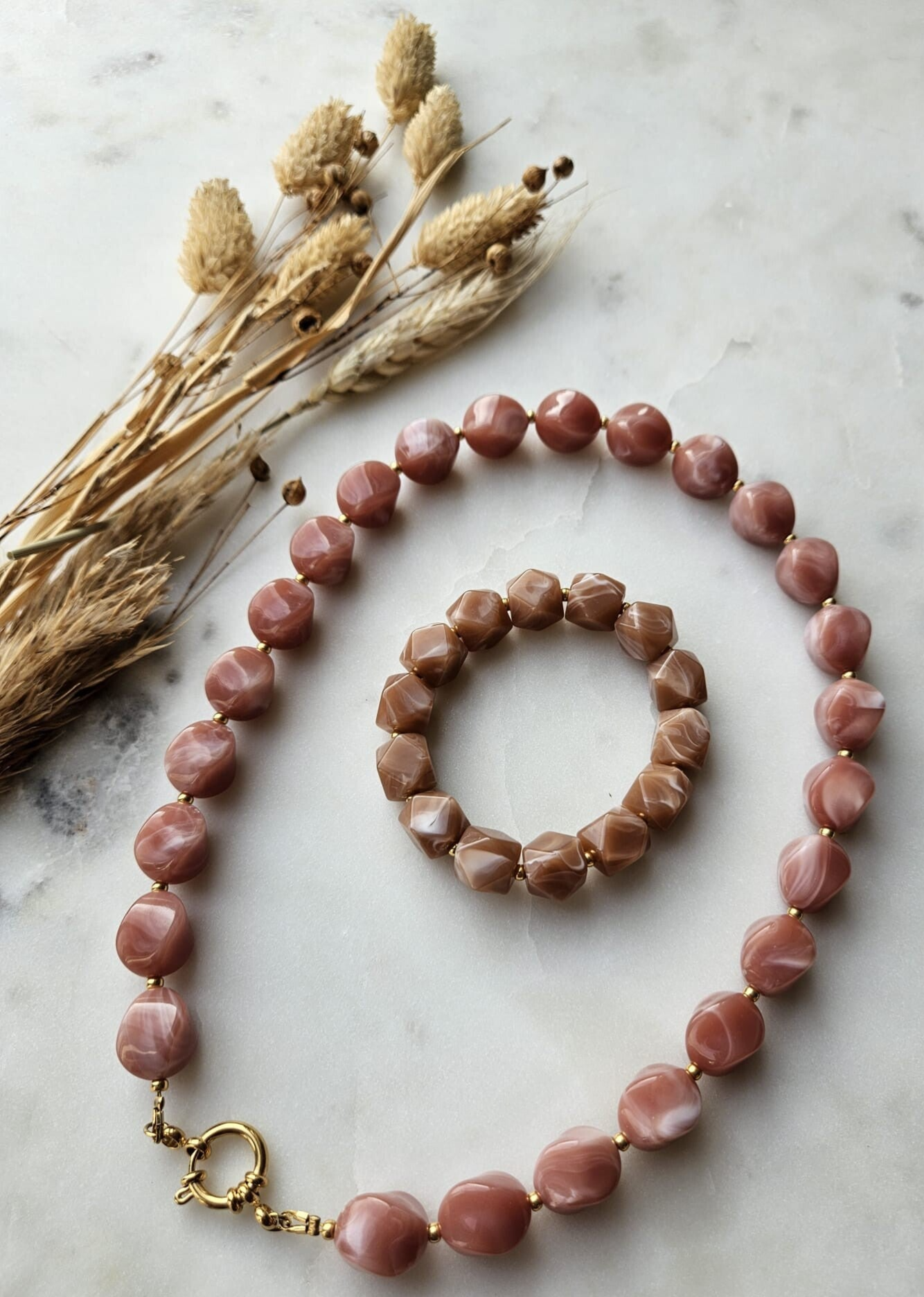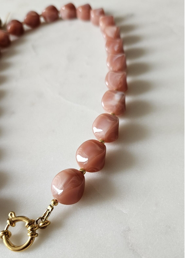 Gemaakt met 'nugget' acryl kralen en afgewerkt op een stainless steel sluiting. Als basis van de ketting kan worden gekozen tussen een gouden of zilveren basis.