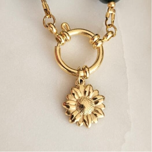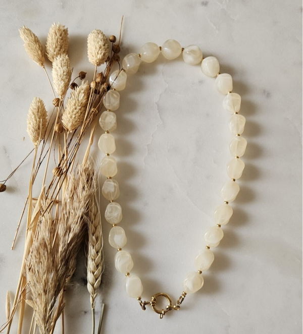 Gemaakt met 'nugget' acryl kralen en afgewerkt op een stainless steel sluiting. Als basis van de ketting kan worden gekozen tussen een gouden of zilveren basis.