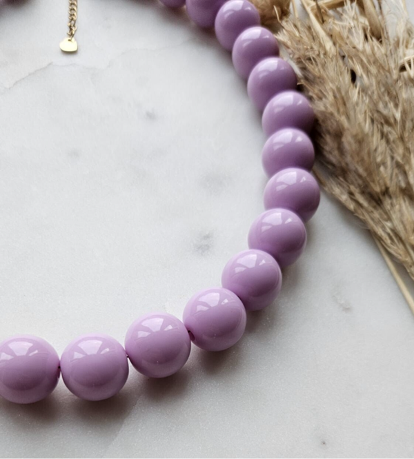 Gemaakt met grote ronde kralen (14mm) en afgewerkt op een stainless steel sluiting. Als basis van de ketting kan worden gekozen tussen een gouden of zilveren basis.