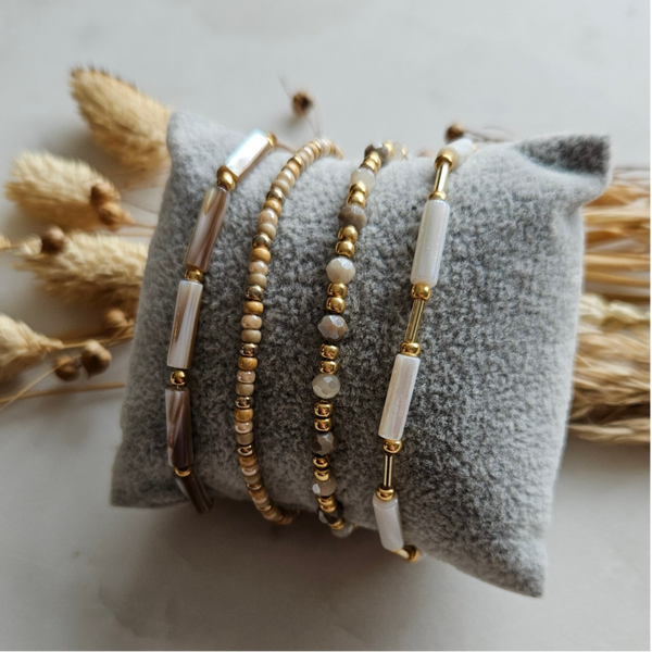 De armbanden uit deze collectie zijn gemaakt van kwalitatief hoogwaardige rocaille glaskralen van het merk 'Miyuki'. Alle kraaltjes zijn van gelijke vorm en kleur. De hoge kwaliteit van deze kralen zorgt ervoor dat alle sieraden lang mee kunnen.