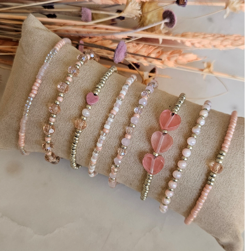 Welkom bij de zilver/roze collectie van Studio Defin. Hier vind je mijn zelf ontworpen en handgemaakte armbanden in zilveren en roze tinten. Mooi afgewerkt met een zilveren stainless steel sluiting en roze accenten. Alle armbandjes kan je bestellen op een sluiting of met elastiek.